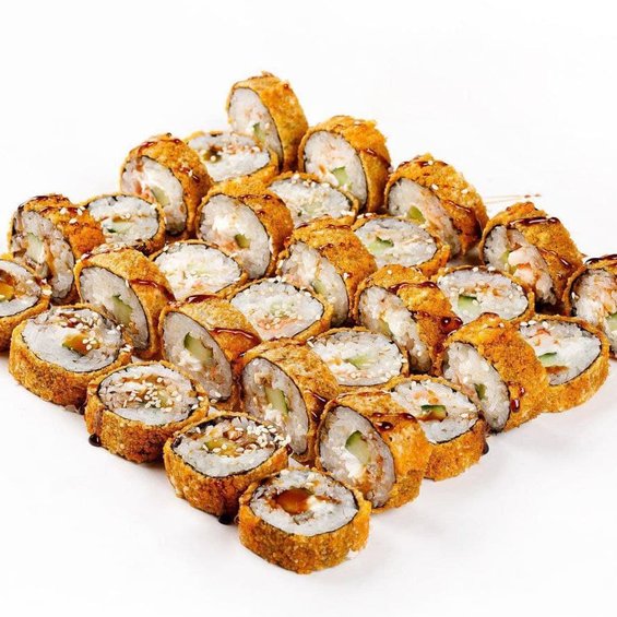 Середня вага одного рола 220г 1. рол з мідією, мааздамом, огірком.2. рол з окунем, латуком, спайсі-соусом, огірком 3. рол зі смаженим лососем, крем-сиром, огірком 4. рол із омлетом, куркою, томатом. Усі роли полити унагі-соусом і посипані кунжутом.