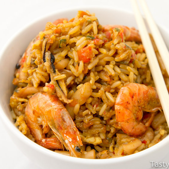 Рис с кальмаром, перцем, луком и мидиями в соусе