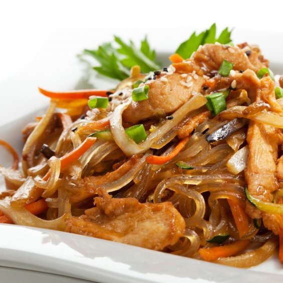 рисовая лапша с пикантным соевым соусом, перцем, томатоми и курочкой "цо", кунжут