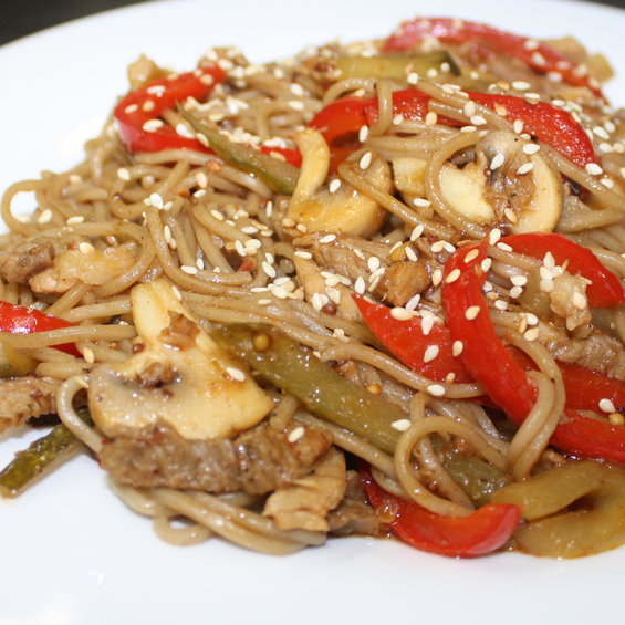 соба, телятина, огурчик кислый, грибы, перец болгарский, горчица в зернах, с соевым соусом