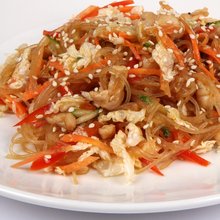 рисовая лапша с пикантным соевым соусом, перцем, томатоми и курочкой "цо", кунжут