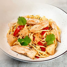 лапша удон с курицей, ананасом, болгарским перцем в сливках с добавлением сладко-острого со...