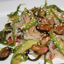 фрунчоза с мидиями, кальмаром, креветушками, морской капустой, авокадо, чукой, кунжутом, им...