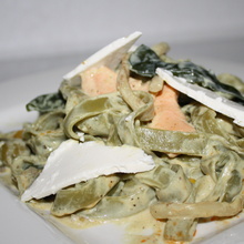 Лосось, кальмар, водоросли вакамэ, оливки, соус сливочный айоли, фета, паста Tagliatelle Ag...