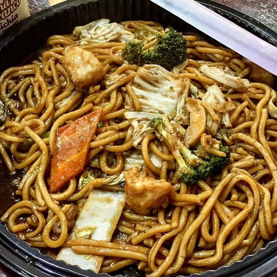 лапша пшеничная "удон" с курицей, брокколи, пекинской капустой, болгарскким перцем. Заправлена соевым соусом