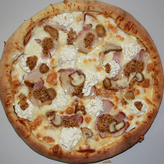 Сир, крем-сир, гірчиця діджонська, бекон, соус bbq, шинка, гриби обсмажені в соевому соусі.