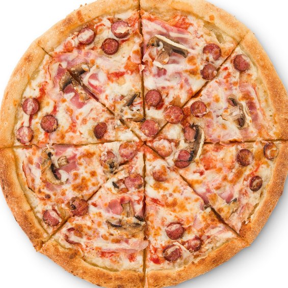 Соус вершково-сирний, бекон, сир моцарела, гриби печериці, ковбаски мисливські.