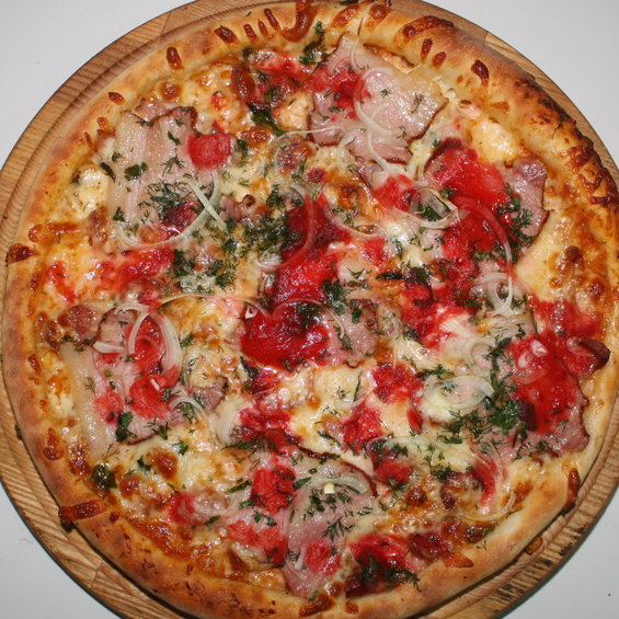 Сыр моцарелла, колбаски охотничьи, бекон, соус томатный, цибуля салатна, зелень, соус чілі.