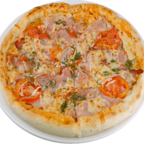 Зелень, соус вершково-сирний, сир, помідори, бекон, шинка.