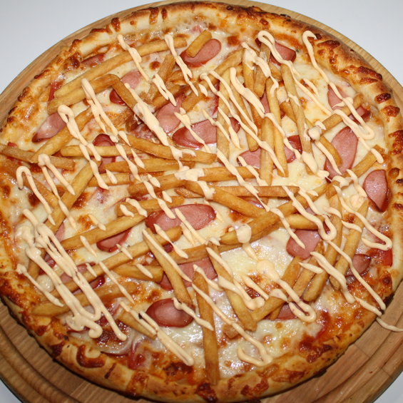 Сир, картофель фри, помідори, соус томатний, шинка, сосиска.
