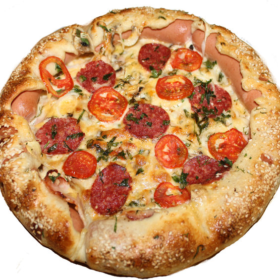 Колбаса салями, зелень, соус вершково-сирний, сир, цибулька, сосиска в бортах, гриби печериці, помідори, курка копчена, шинка.