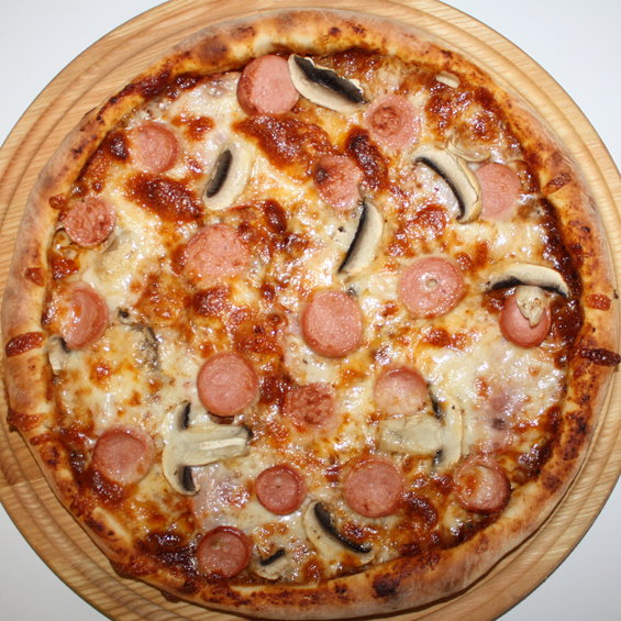 Гриби Печериці, курка копчена, соус bbq, сосиска.