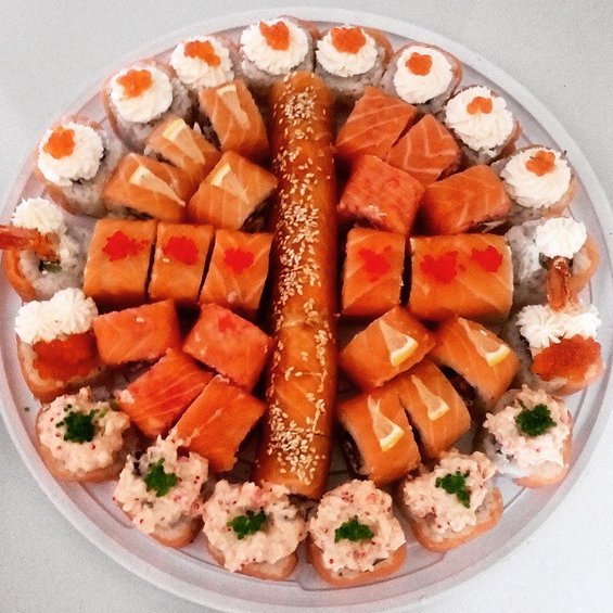 Путь дракона (манго, огурчик, сыр, лосось м/с, угорь, креветка, снежный краб, тобико, красная икра);