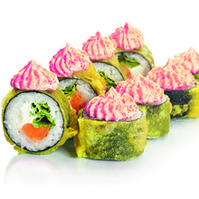 ролл в зеленой масаго с жареным лососем, огурцом - "шапочка" из сырного соуса с добав... Змінити склад: