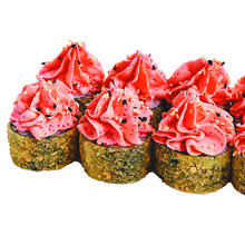ролл в красной масаго с крем-сыром, креветкой, авокадо. Микс из лосося, спайси соуса ... Змінити склад: