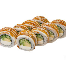 рол з крем-сиром, авокадо, огірком. Вкритий копченим окунем. Политий унагі-соусом, кунжут Змінити склад:
