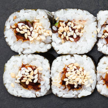 рол в кунжуті із мідіями, крем-сиром, унагі-окунем, огірком та крем-сиром Змінити склад: